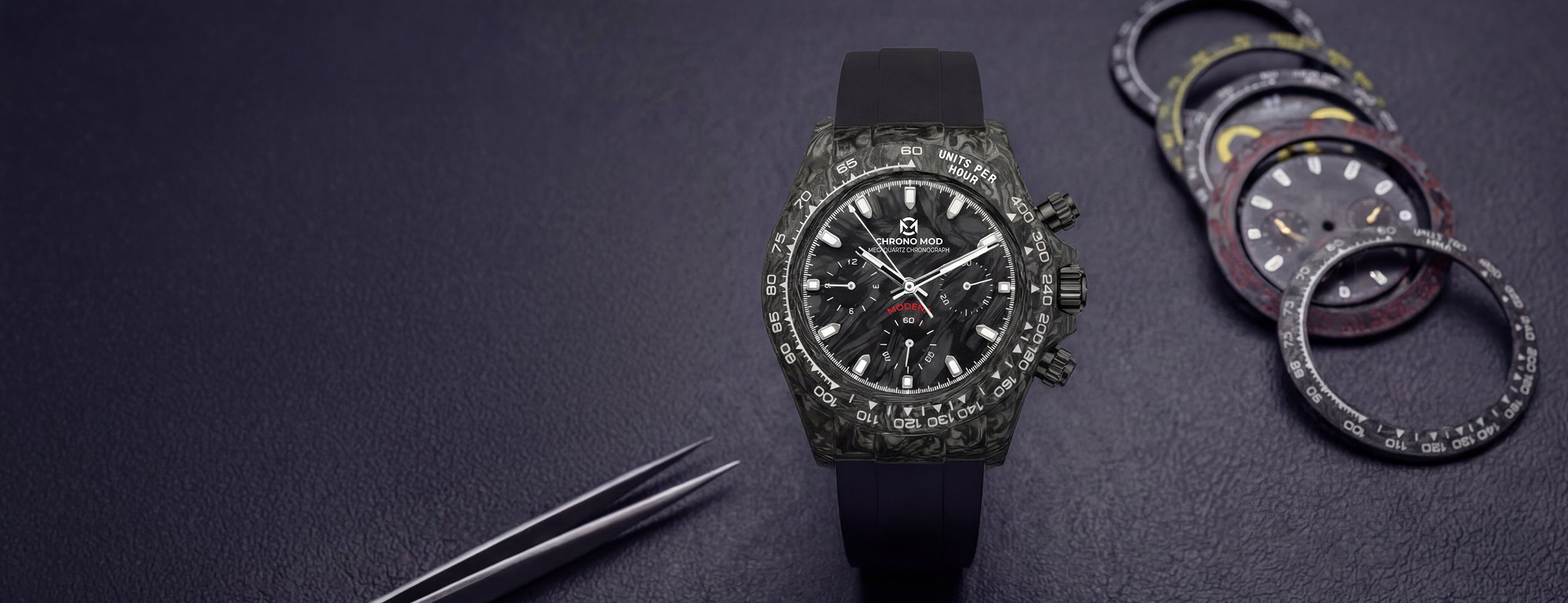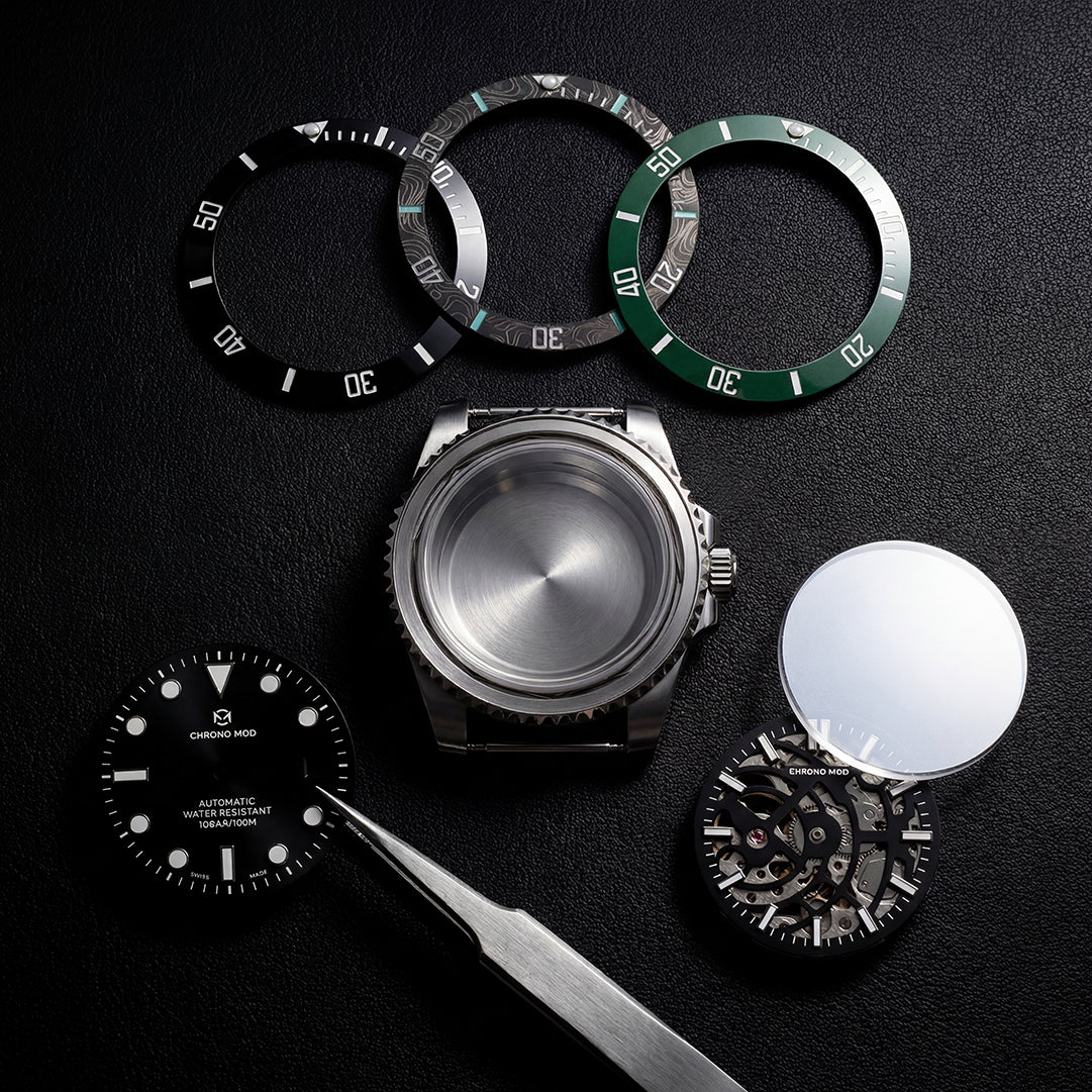 Select your case, dial, and bezel from our premium 316L stainless steel, titanium and carbon collection to create a timepiece that reflects your style.