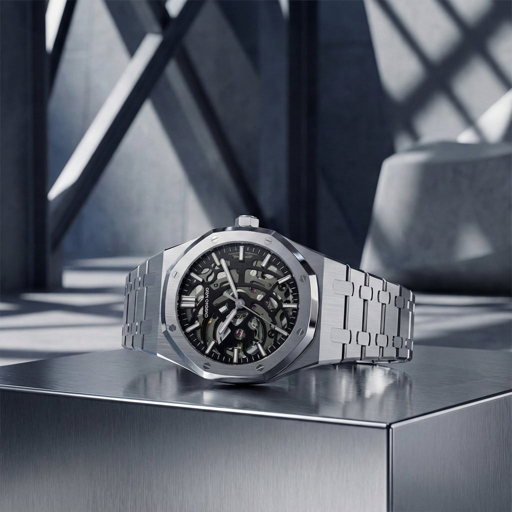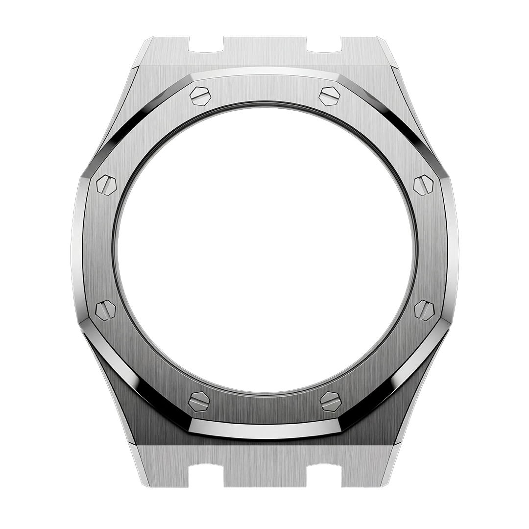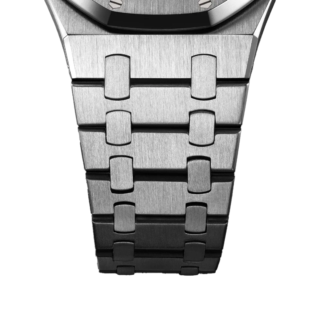 The Apex–style case is defined by its iconic octagonal geometry, sharp lines, and seamless integration with the bracelet. Crafted with a refined mix of brushed surfaces and polished bevels, it delivers a striking architectural presence on the wrist. Its bold silhouette, inspired by luxury sports watch design, offers a perfect balance of strength, finesse, and modern elegance.