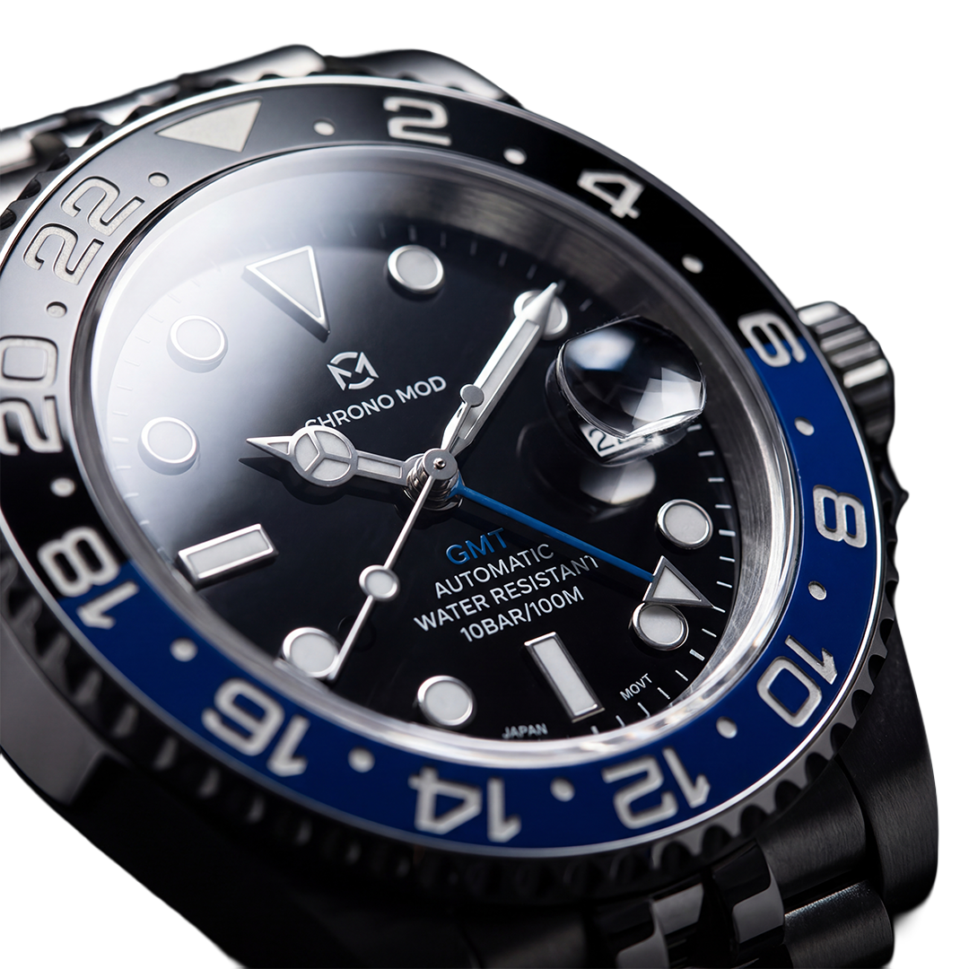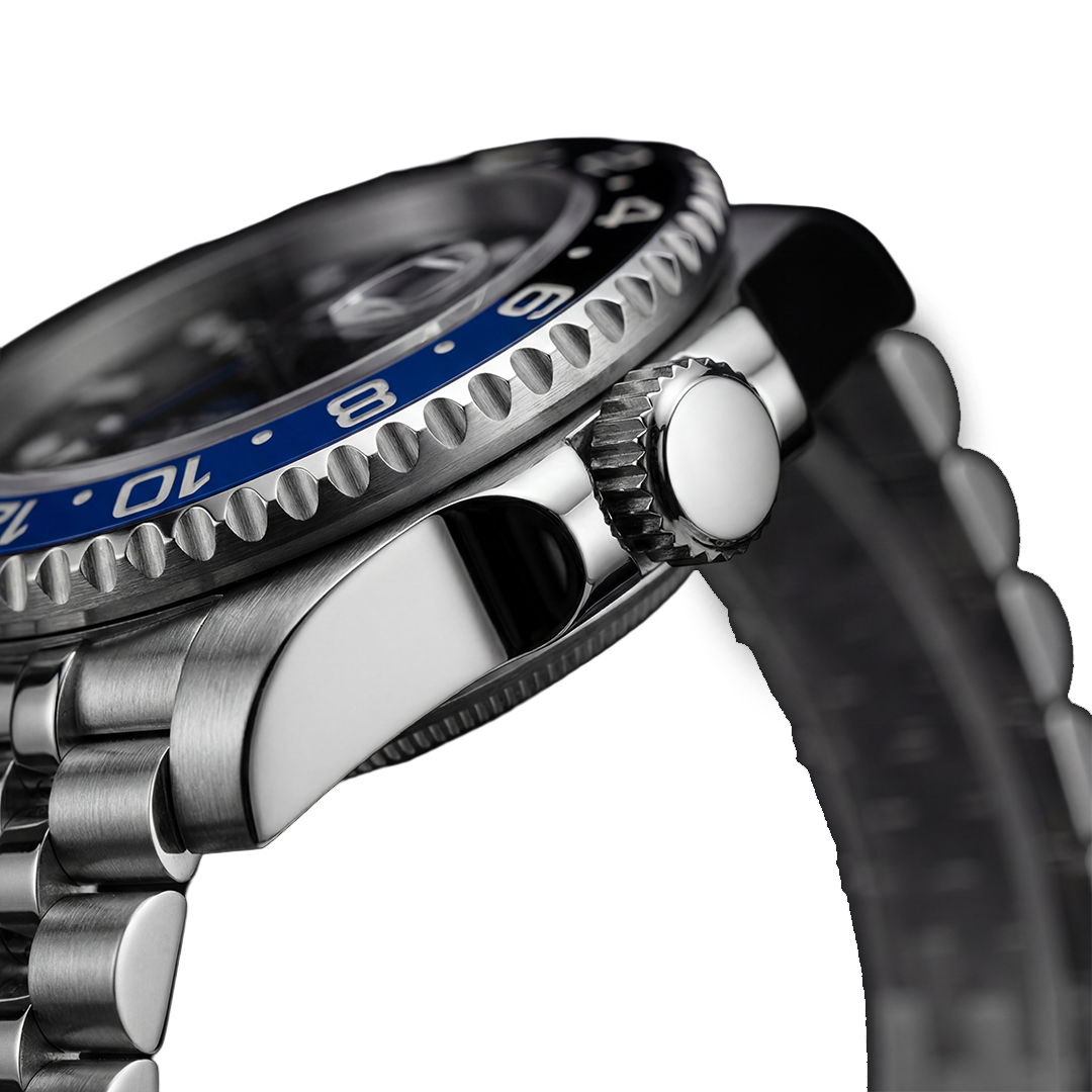 Dual-tone ceramic bezel, luminous markers, sapphire crystal with cyclops magnifier. A dedicated GMT hand tracks a second timezone at a glance. Each watch is assembled and inspected individually.