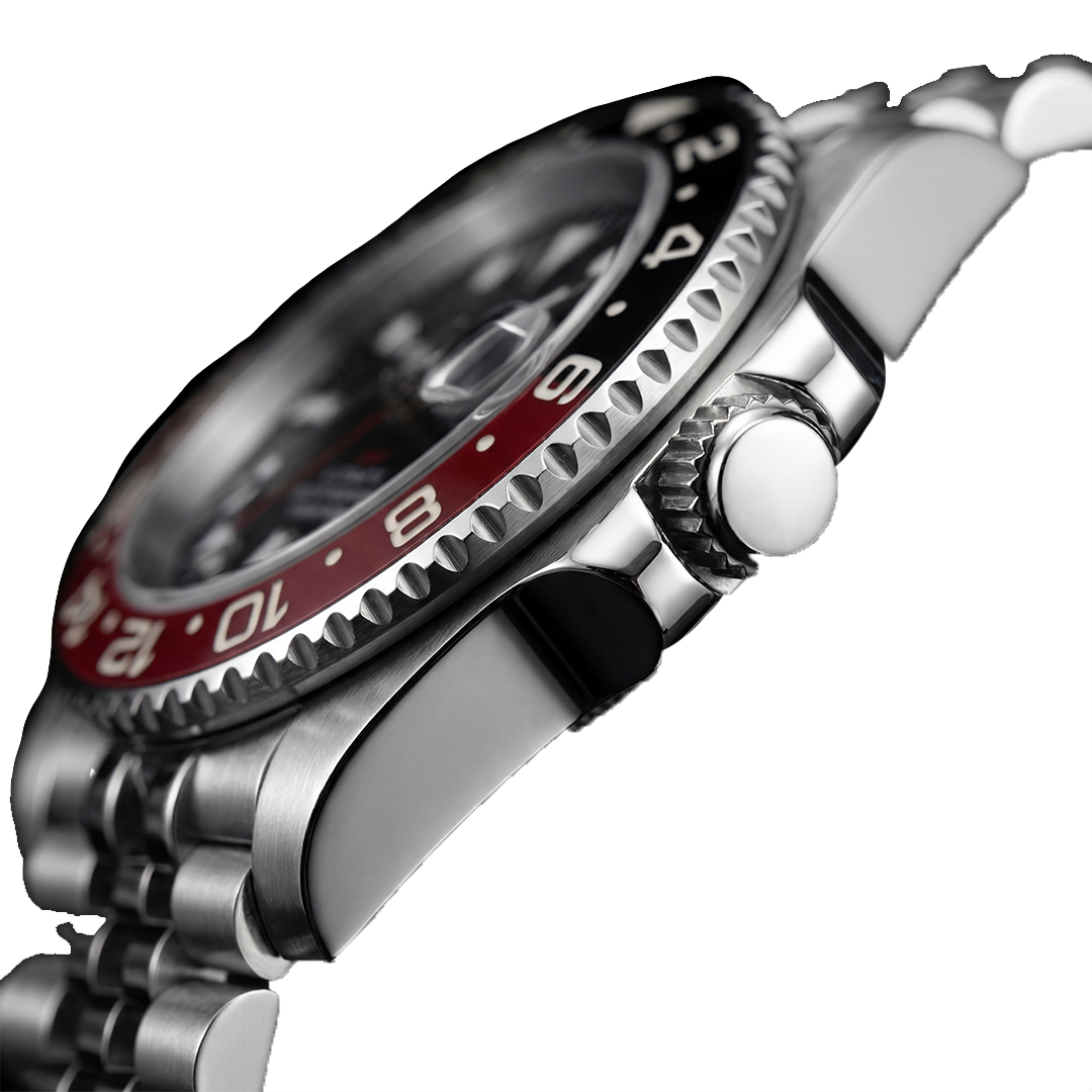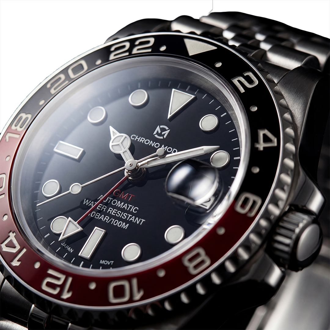 Dual-tone ceramic bezel, luminous markers, sapphire crystal with cyclops magnifier. A dedicated GMT hand tracks a second timezone at a glance. Each watch is assembled and inspected individually.