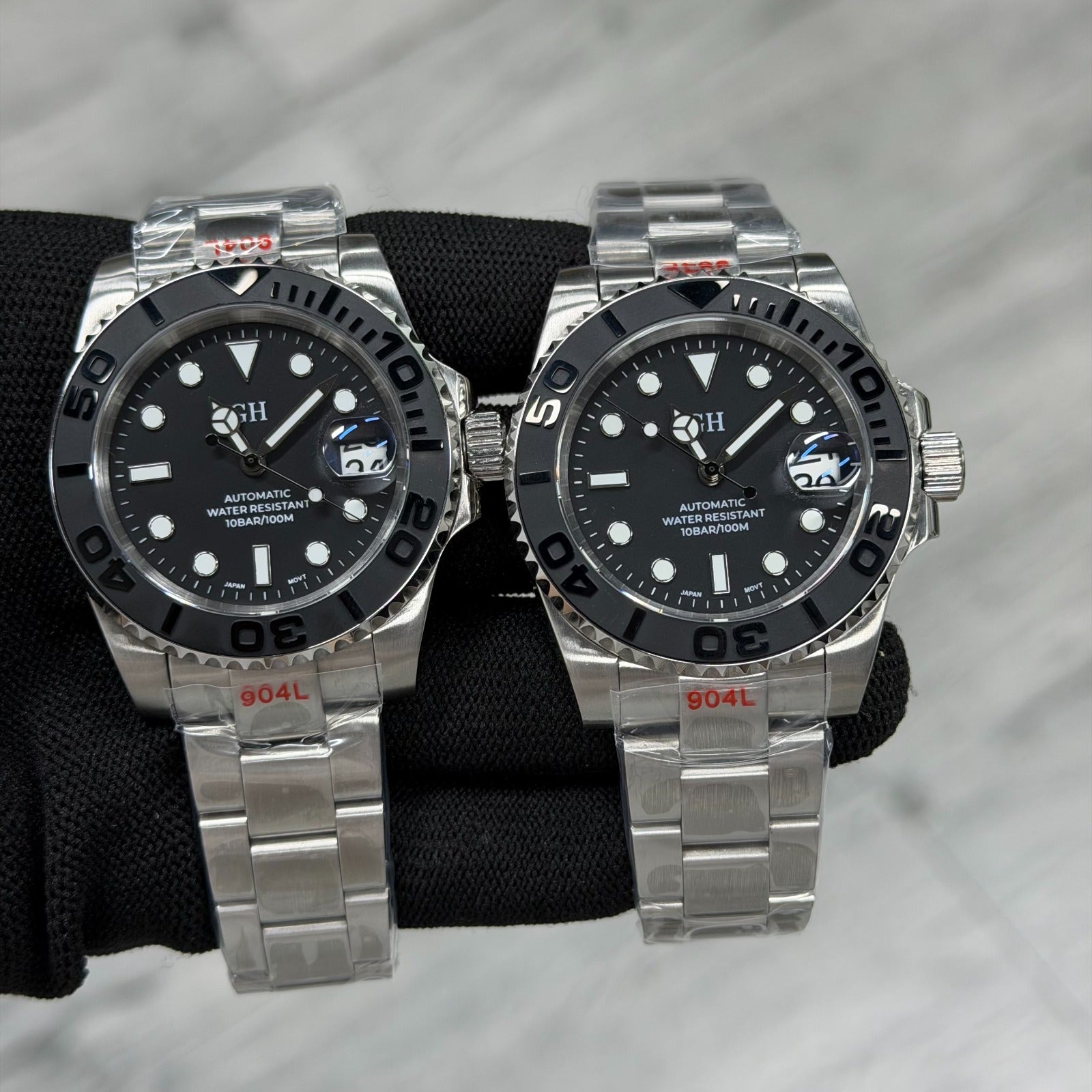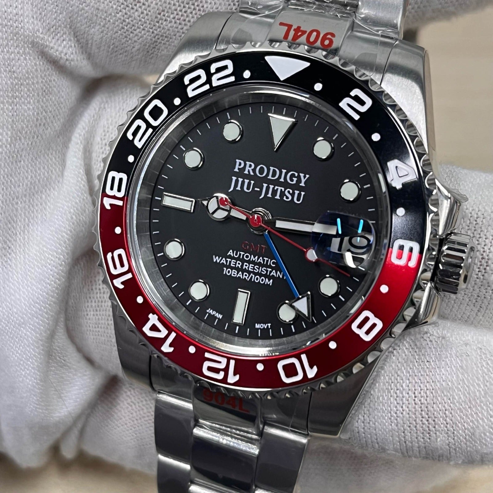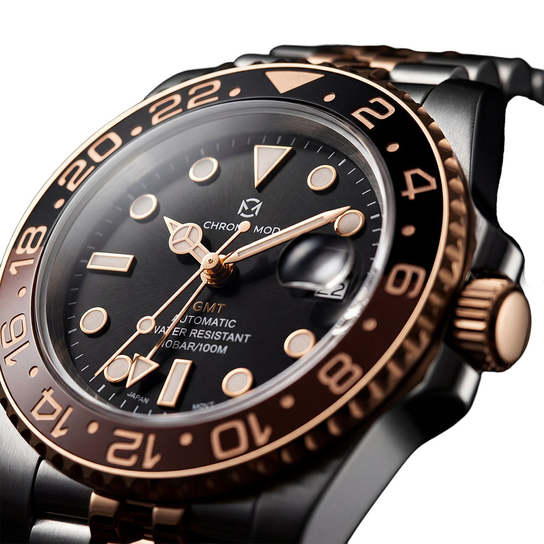 Dual-tone ceramic bezel, luminous markers, sapphire crystal with cyclops magnifier. A dedicated GMT hand tracks a second timezone at a glance. Each watch is assembled and inspected individually.