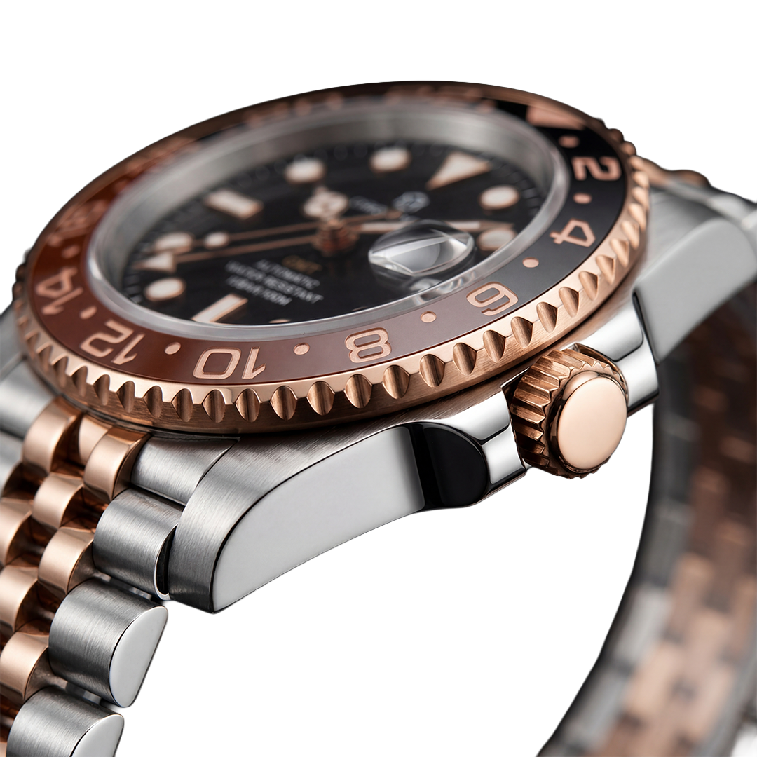 Screw-down crown, dual-tone ceramic bezel, 100m water resistance. Set your second timezone with a single turn. Built for travelers who never settle for less.