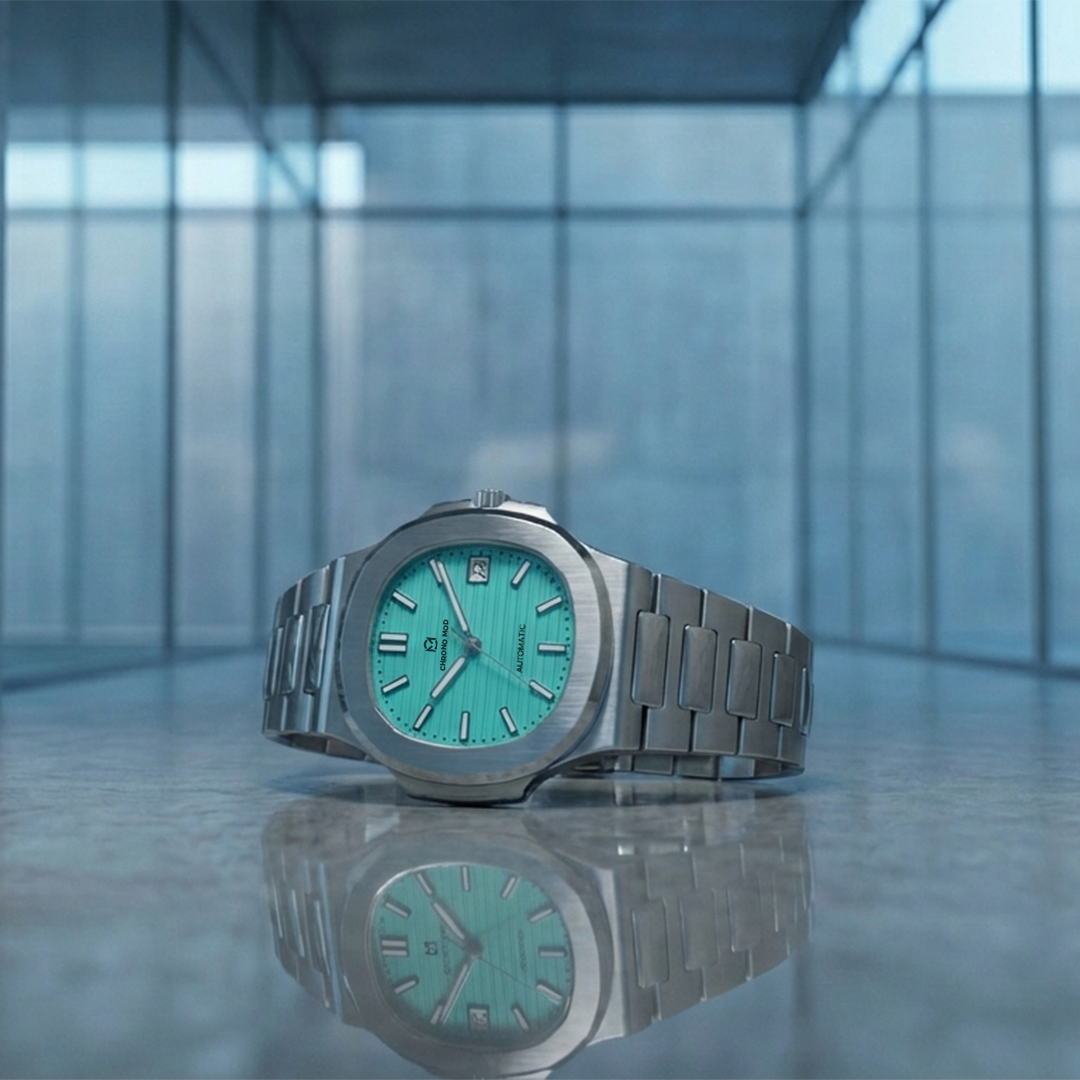 The inspired case shape embodies a unique blend of sportiness and refined elegance. Defined by its rounded octagonal silhouette and integrated case-to-bracelet lines, it brings a bold architectural presence to the wrist. Its smooth edges, horizontal dial textures, and seamless proportions create a look that feels both modern and timeless — a signature aesthetic recognized for its balance, versatility, and effortless sophistication.