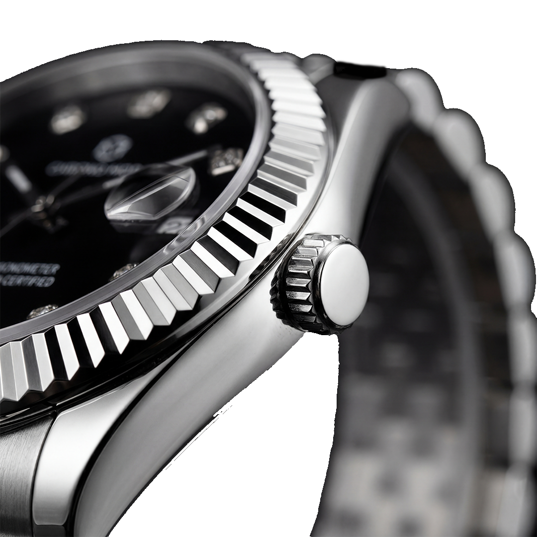 Un véritable mouvement mécanique qui se remonte à chaque mouvement de votre poignet. Cadran à chiffres arabes avec une finition soleillée qui change selon la lumière. Fenêtre de date à 3 heures, lunette cannelée, bracelet jubilee, chaque détail est conçu pour être porté au quotidien et admiré à chaque instant.