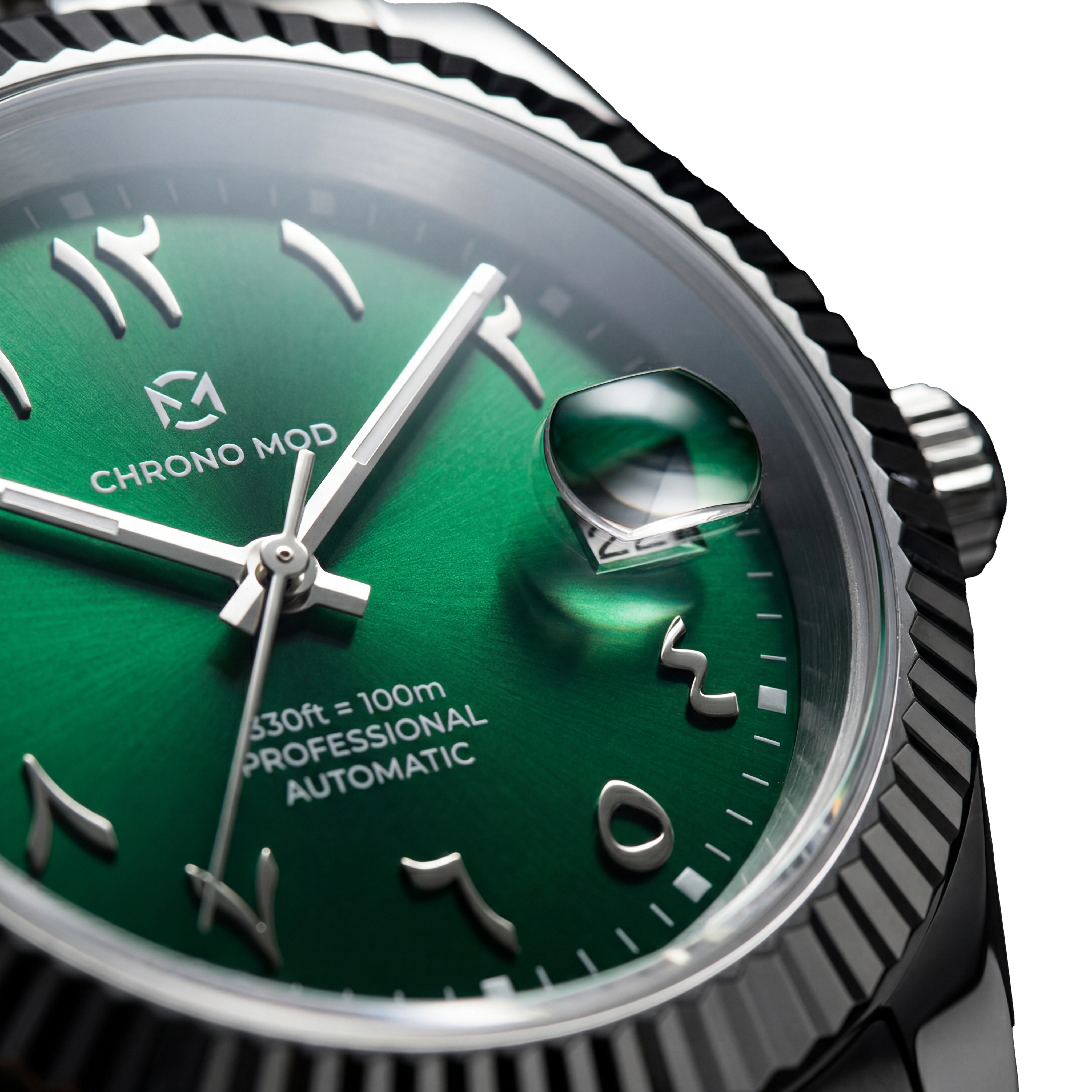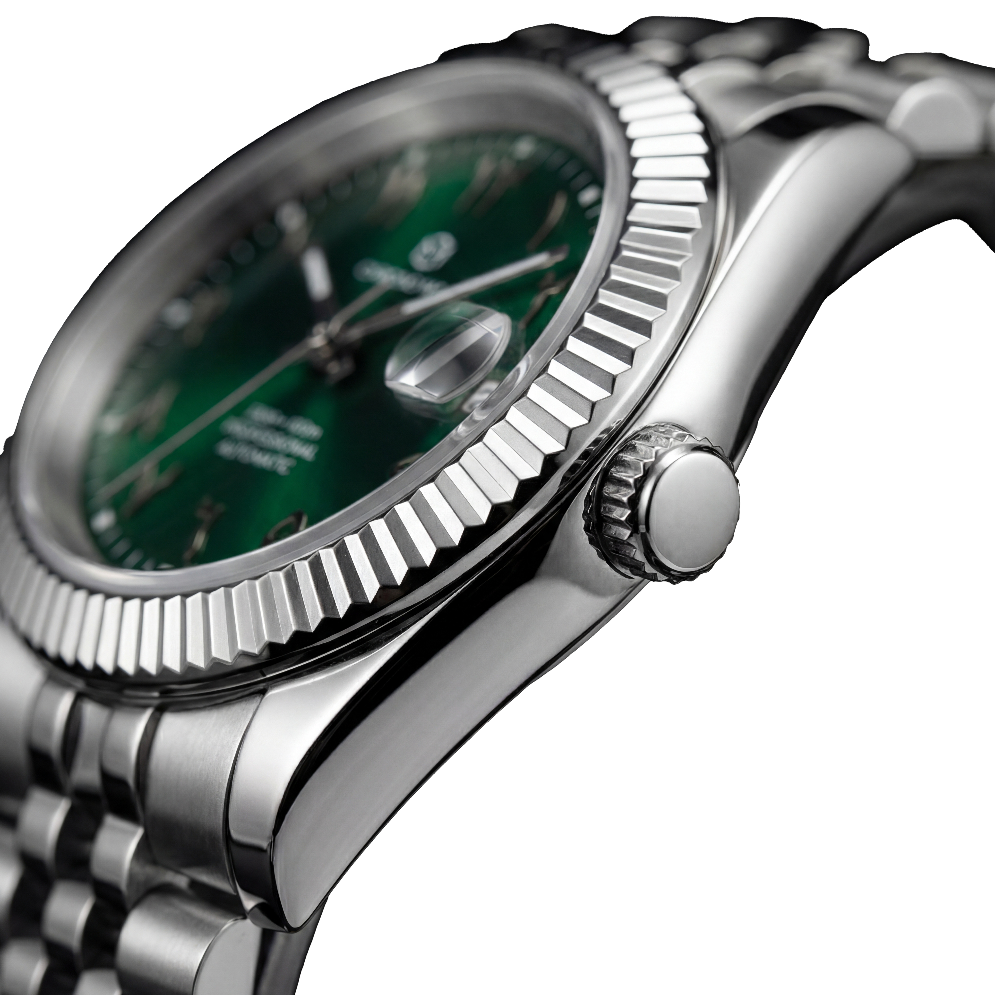 Un vero movimento meccanico che si carica con ogni movimento del polso. Quadrante con numeri arabi e finitura a raggiera che cambia con la luce. Finestra della data alle 3, ogni dettaglio progettato per essere indossato ogni giorno e ammirato ogni volta.