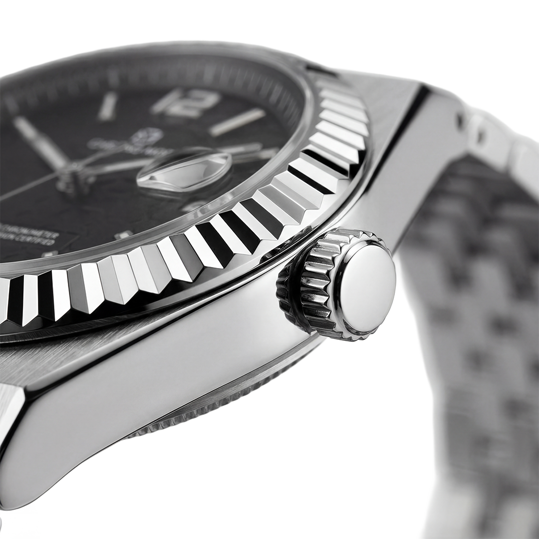 Ghiera scanalata con bordi affilati come rasoi, corona zigrinata, quadrante a nido d'ape visibile attraverso il cristallo zaffiro. Progettato per farsi notare — costruito per durare una vita intera.