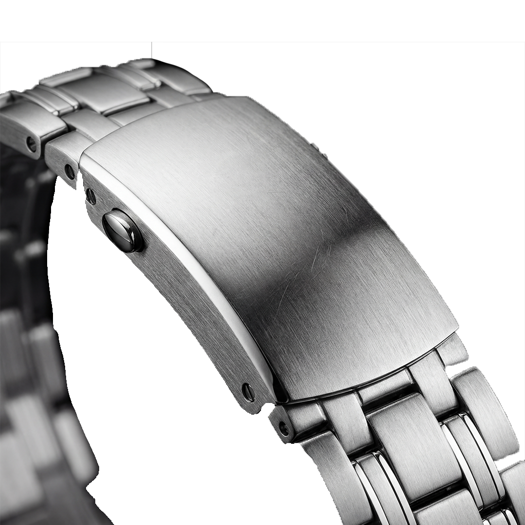 Bracciale in acciaio con maglie solide, chiusura deployante a pulsante e finitura satinata spazzolata. Sicuro, confortevole, progettato per durare. La stessa costruzione utilizzata dai marchi di lusso svizzeri — senza il sovrapprezzo.