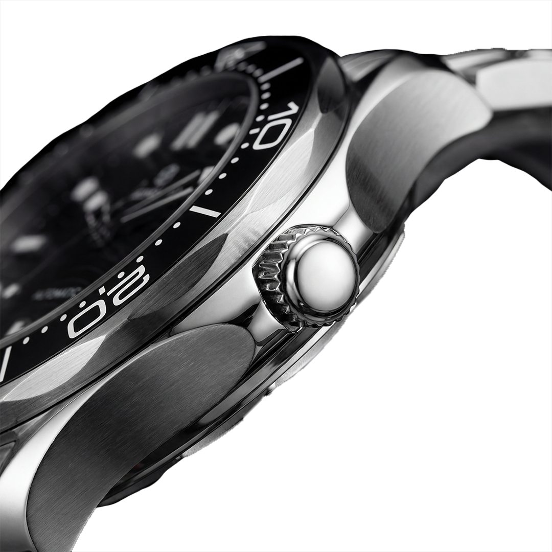 Corona a vite, lunetta subacquea in ceramica, anse torsionate con fianchi lucidati a specchio. Resistenza all’acqua fino a 100 m per prestazioni reali — dall’oceano alla sala riunioni.