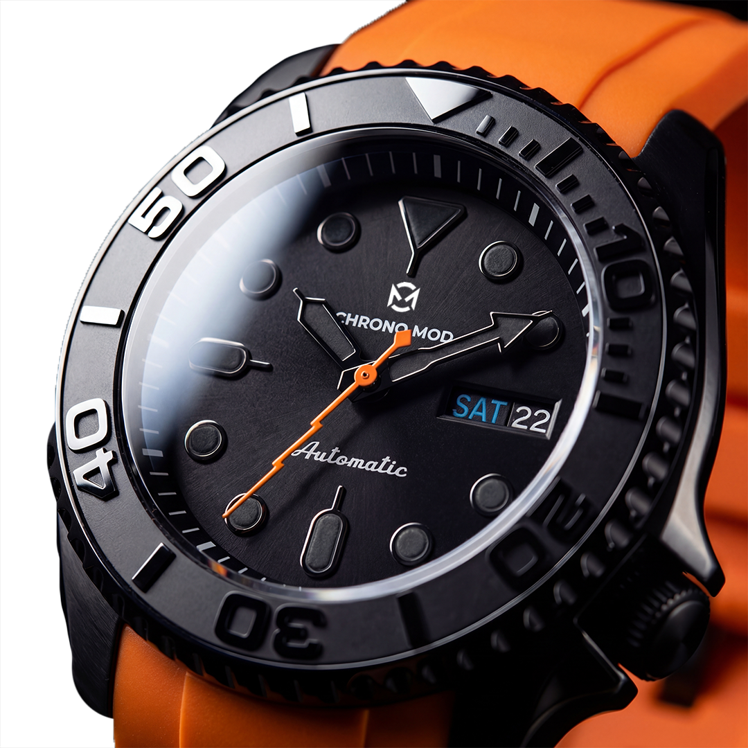 Stealth zwarte wijzerplaat met aangebrachte luminieuze markers, oranje accenten op de secondenwijzer, dag-datum complicatie op 3 uur. Elk horloge wordt individueel geassembleerd en geïnspecteerd. Geen machines, geen shortcuts. Dit is horlogemakerij, geen productie.