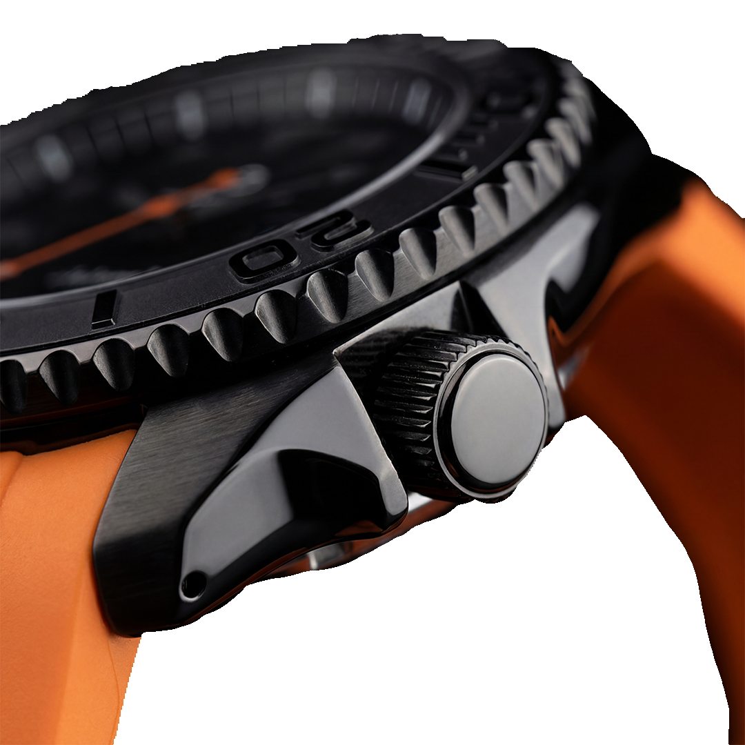 Volledig zwarte PVD-behuizing, schroefkroon met kroonbeschermers, gezaagde unidirectionele bezel. Ontworpen voor wie prestaties zonder compromissen eist — op het land of op zee.